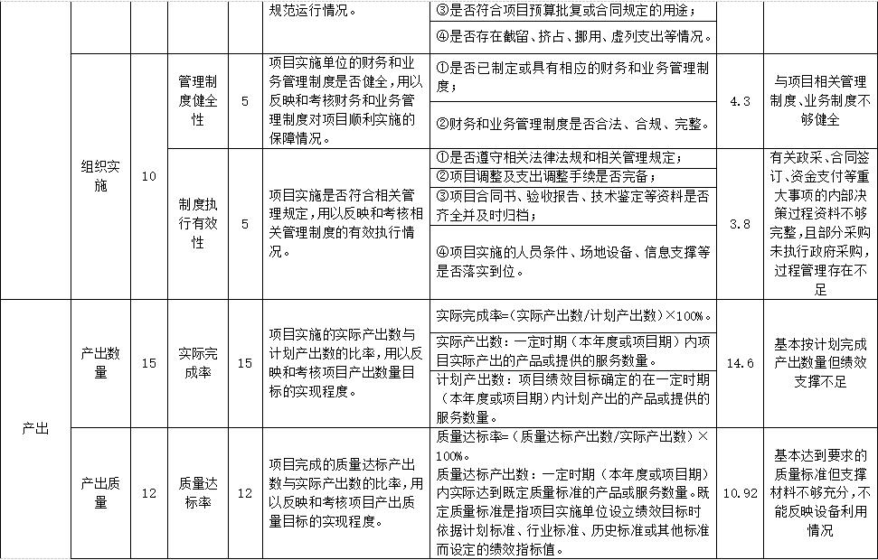 2、项目过程情况:管理过程指标,满分20分,评价得分17.50分,财务管理制度和内部控制机制基本健全,项目资金支出管理较为严谨,严格按照项目预算内容执行,且在实际执行过程中,预算经费专款专用、独立核算,能够对项目资金的安全性、有效性提供有力保障;项目组织较为健全,项目采取公开招投标进行采购的流程较为规范,措施较为到位,能够确保项目的顺利实施;该项目过程管理基本规范,制定了相关管理制度,项目组织较为严谨,措施管理比较到位,项目监督、反馈、沟通、协调机制比较健全。