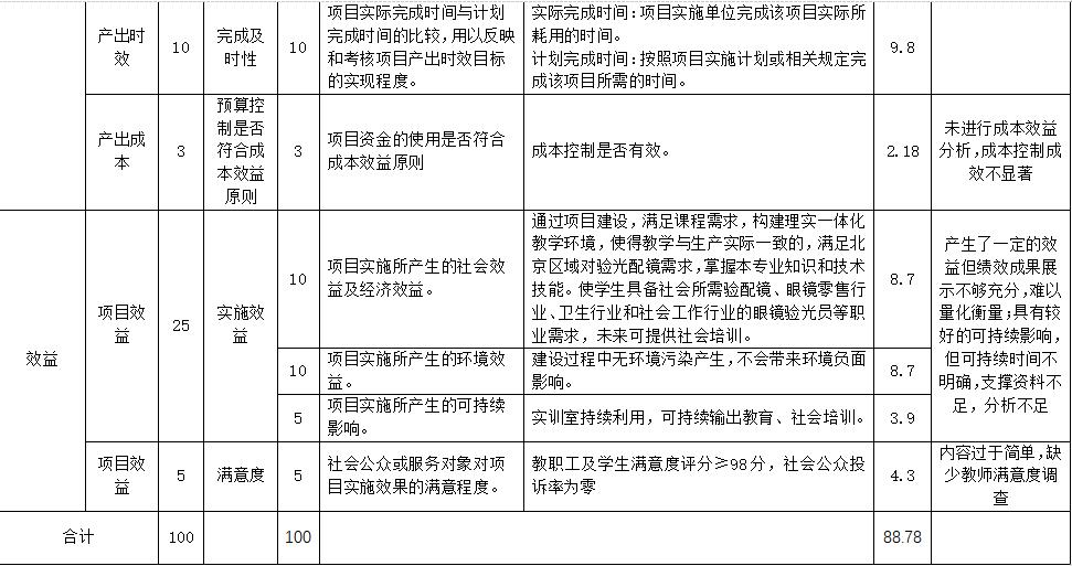 经评价,该项目综合考评得分88.78?分。其中,项目决策8.18分,项目管理17.50分,项目产出37.50分,项目效益25.60分,综合绩效评定结论为“良好”。