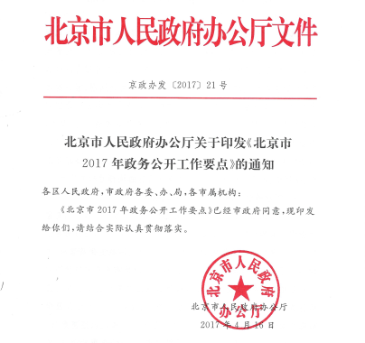 2017年,北京市深入学习贯彻党的十九大精神,以习近平新时代中国特色社会主义思想为指引,认真落实党中央、国务院关于全面推进政务公开工作的系列部署,严格履行《中华人民共和国政府信息公开条例》法定义务,围绕市委市政府中心工作,全面推进决策、执行、管理、服务、结果公开(以下统称"五公开"),加强政策解读、扩大公众参与,充分发挥公开促落实、促规范、促服务的作用。