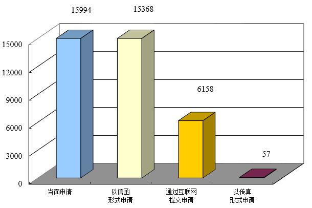 全市申请总数为37499件。申请方式中,当面申请15994件,占总数的42.65%;以传真形式申请57件,占总数的0.15%;通过网络提交申请6158件,占总数的16.42%;以信函形式申请15368件,占总数的40.98%。(因同一申请可以多种申请方式提出,故分类申请之和大于申请总数。)