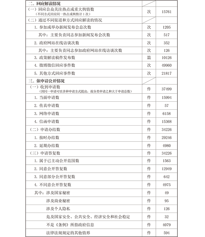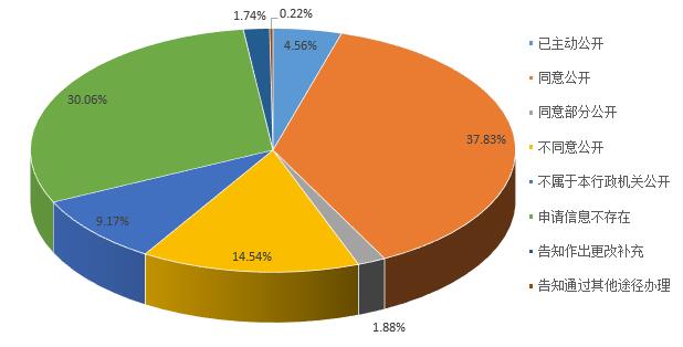 已答复的34226件申请中:"属于已主动公开范围"1563件,占总数的4.56%;"同意公开"12949件,占总数的37.83%;"同意部分公开"642件,占总数的1.88%;