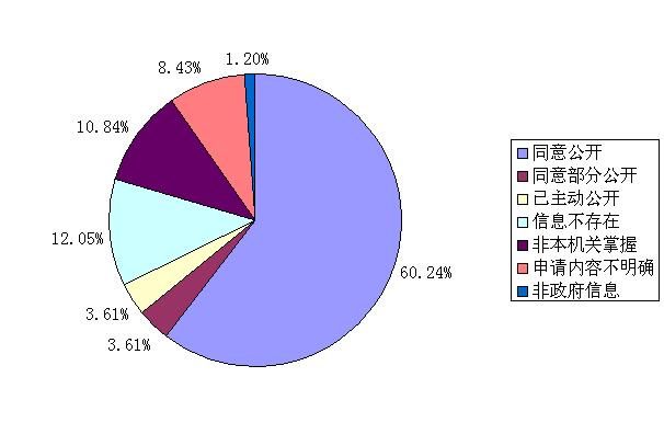 已到答复期的申请38件,涉及内容83项,已全部按期答复。其余未到答复期的申请按照《条例》规定在时限内进行答复。已答复申请事项中:同意公开50项,占总数的60.24%;同意部分公开3项,占总数的3.61%;已主动公开3项,占总数的3.61%;信息不存在10项,占总数的12.05%;非本机关掌握9项,占总数的10.81%;申请内容不明确7项,占总数的8.43%;非政府信息1项,占总数的1.20%。