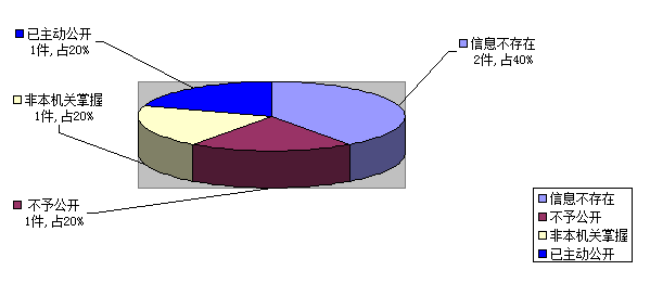 我局受理的5件政府信息公开申请,均在法定之日内向申请人出具了登记回执,全部按期答复并向申请人寄发了答复告知书。其中,“信息不存在”2件,占总数的40%;“非本机关掌握”1件,占总数的20%;“不予公开”1件,占总数的20%;“已主动公开”1件,占总数的20%。