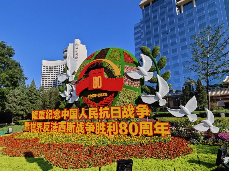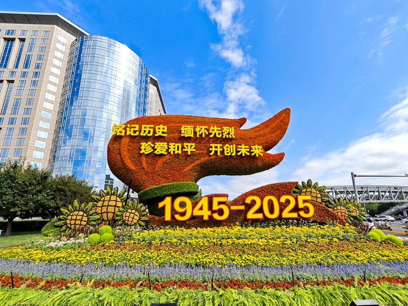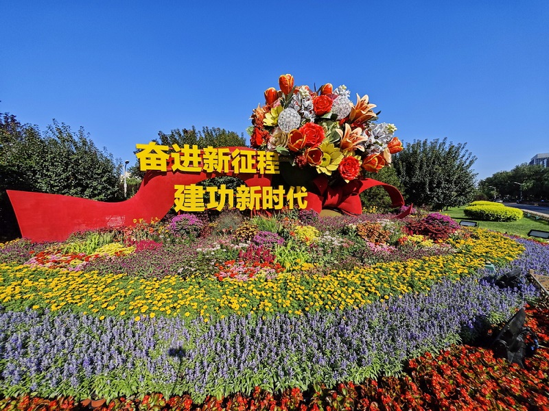 近日,为纪念抗战胜利80周年而搭建的主题花坛已基本完工,吸引了不少市民、游客前来拍照留念。10组花坛分布于长安街沿线的建国门、东单、西单、复兴门附近。上图:奋进新征程,建功新时代。未来一起走花路!花坛位置:复兴门。(摄影:乔健)