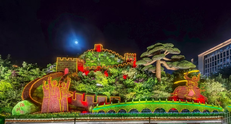 保卫华北,长城等元素组合而成。居安思危,牢记使命。花坛位置:东单西南角。(摄影:王越)
