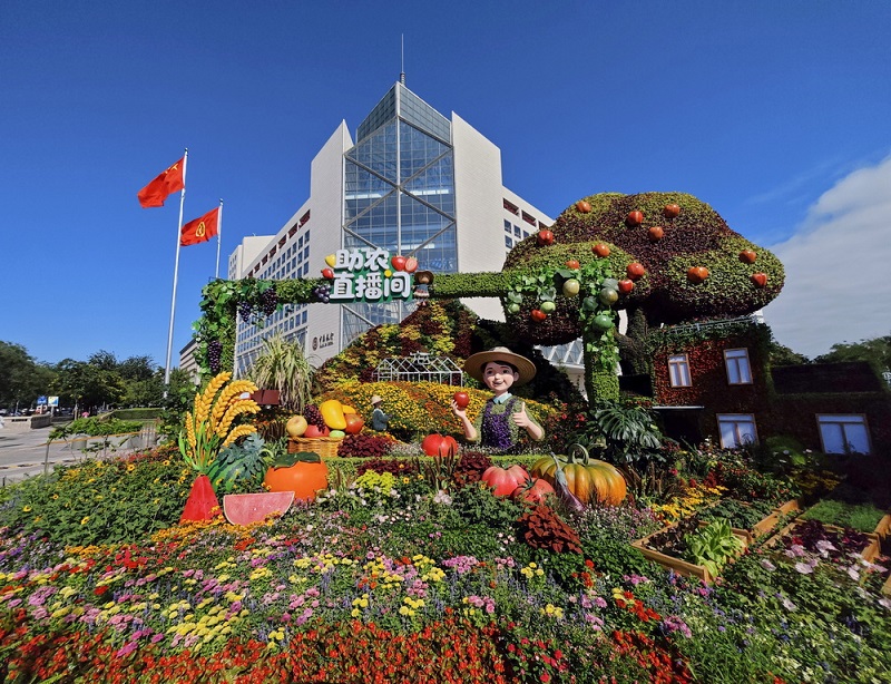 助农直播间,丰收氛围满满~小编忍不住想去来一单啦!花坛位置:西单西北角。(摄影:乔健)